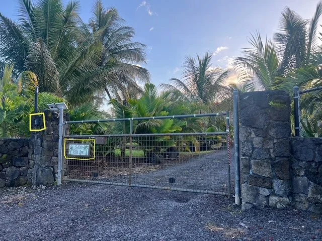 LANDMARKS: Look for 2 rock columns, a grey gate, and the address sign on the left side of gate (see 2 images below). We hope to avoid guests pulling into neighbor’s driveways, so please look for these landmarks. And please note if arriving in the evening hours: It is very dark here at night with little to no light pollution. So please keep this link handy at your arrival and use the above google maps PIN. Mahalo